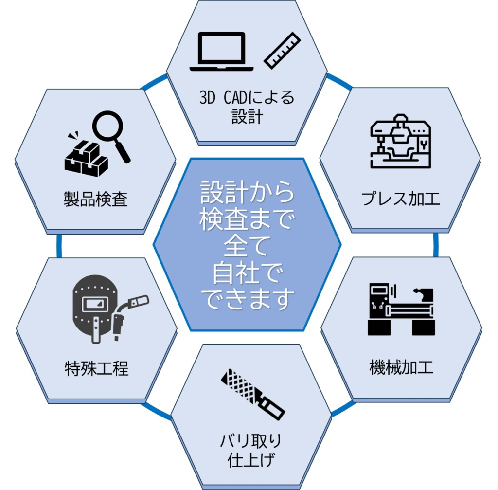 現在では特殊工程・機械加工が加わり、更には板金加工で使用する金型の設計から製作・組み立て・メンテンナンスまでを自社で行なえる程に成長しております。