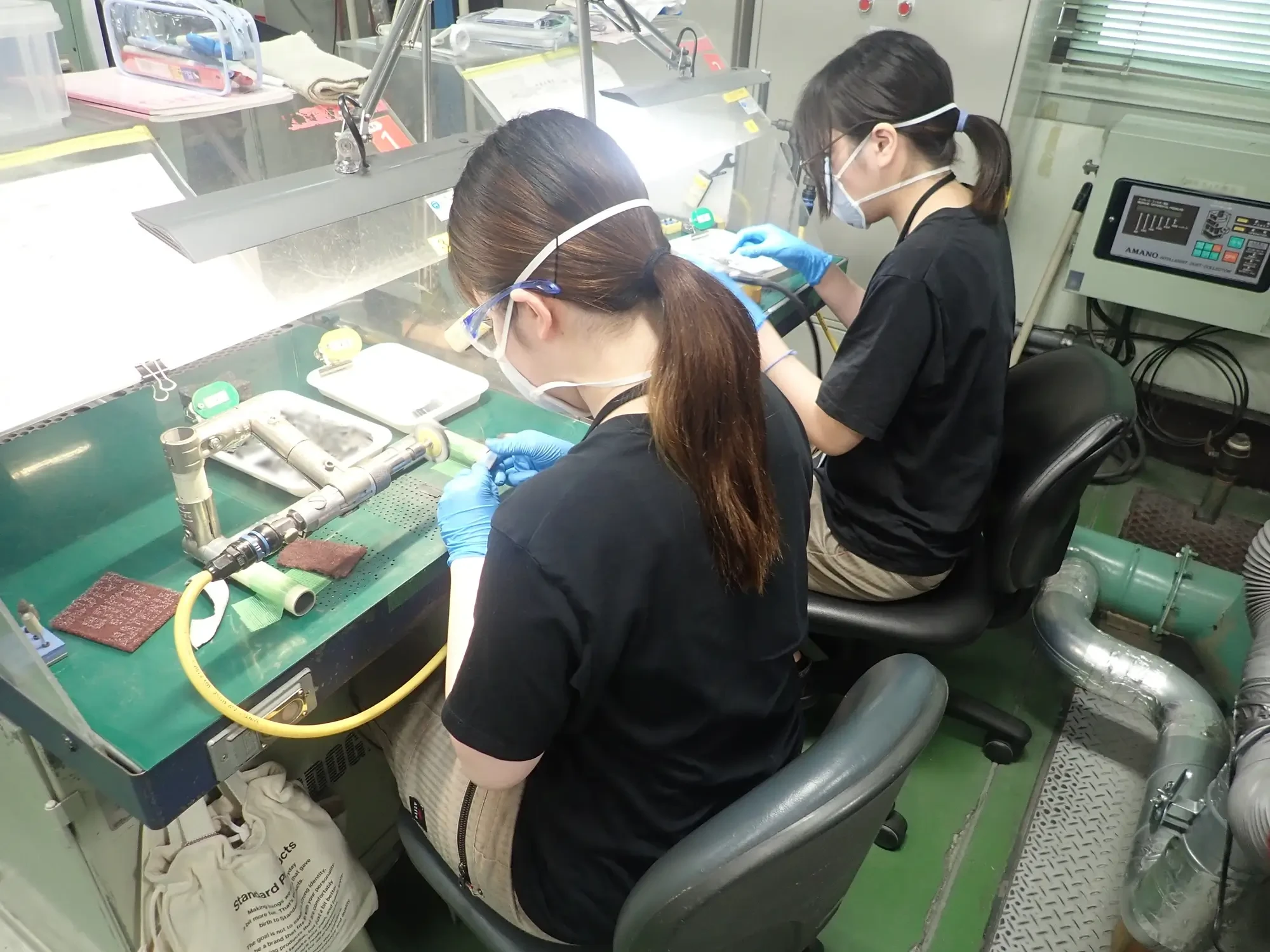 加工途中でできた「バリ」の除去や、ひずみ・歪みの修正、面取り加工など、一つ一つ丁寧な手作業によって仕上げていきます。また、電解エッチング等のマーキングも対応しています。